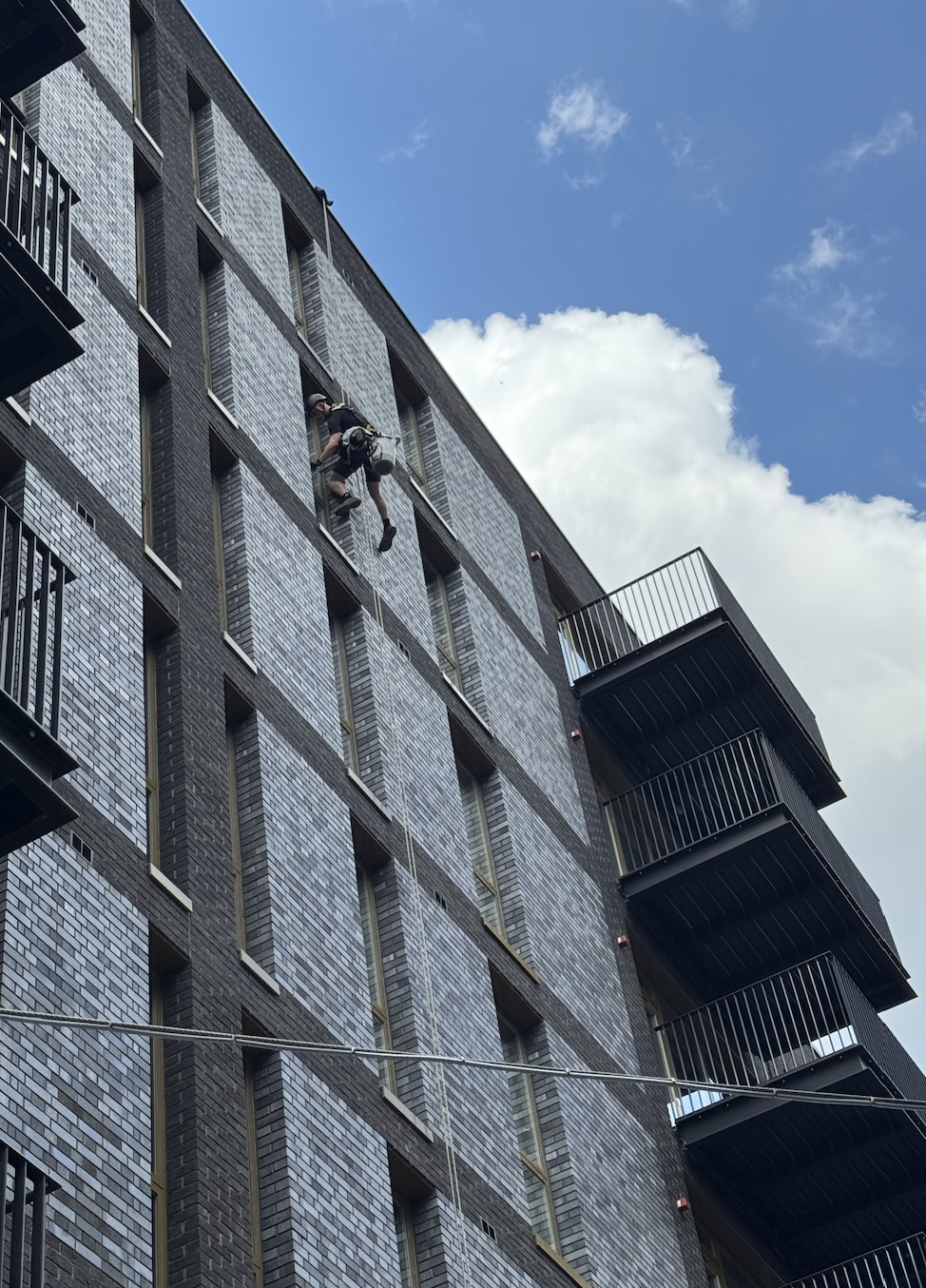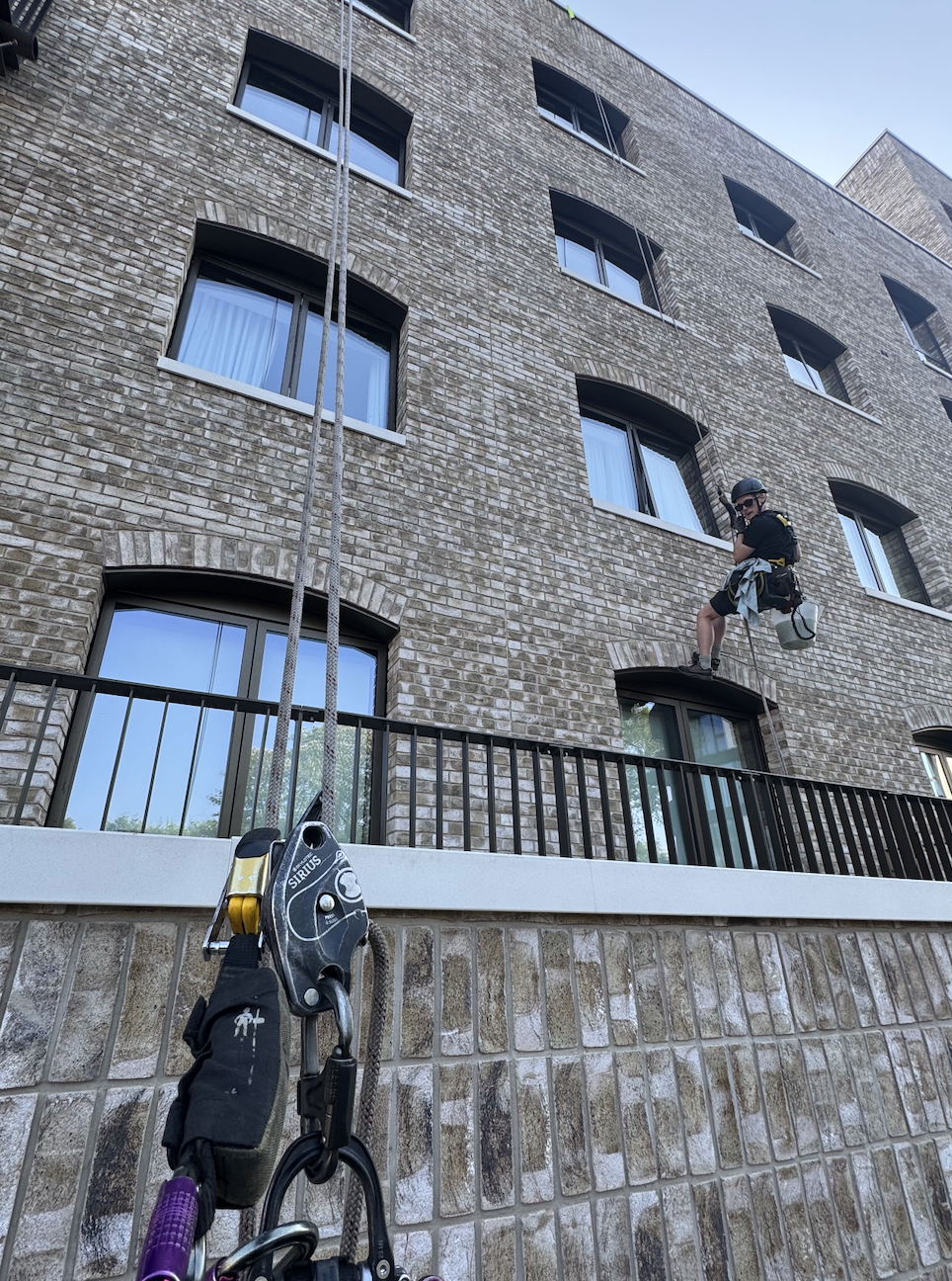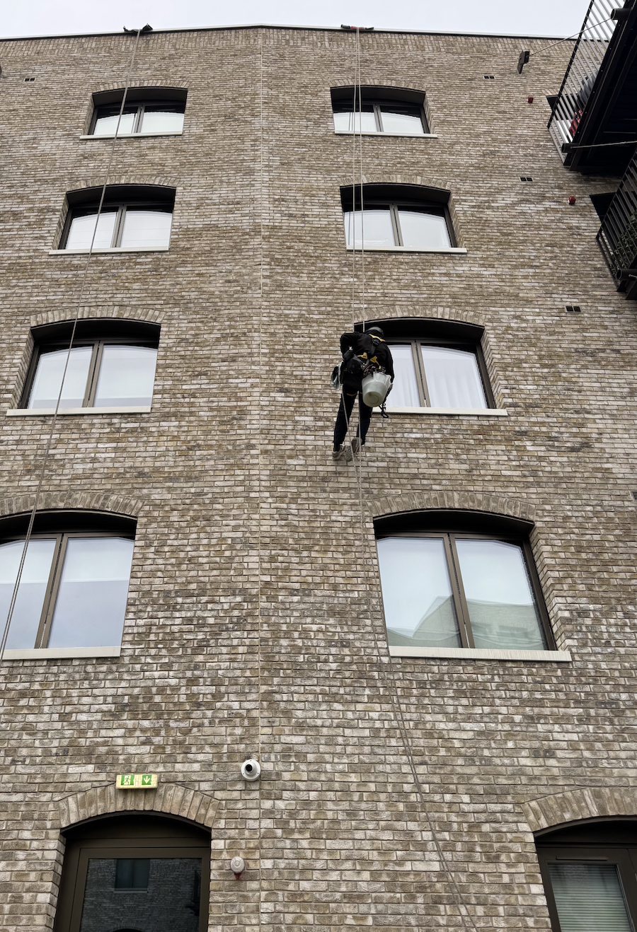 Aquamark clean all external windows at this site every four month via rope access using the davit arms on site. Where there aren’t davit arms installed, we use a deadweight counterweight system.