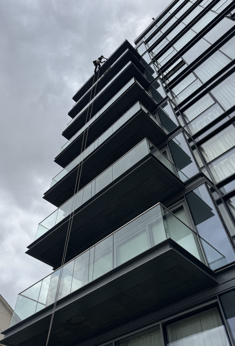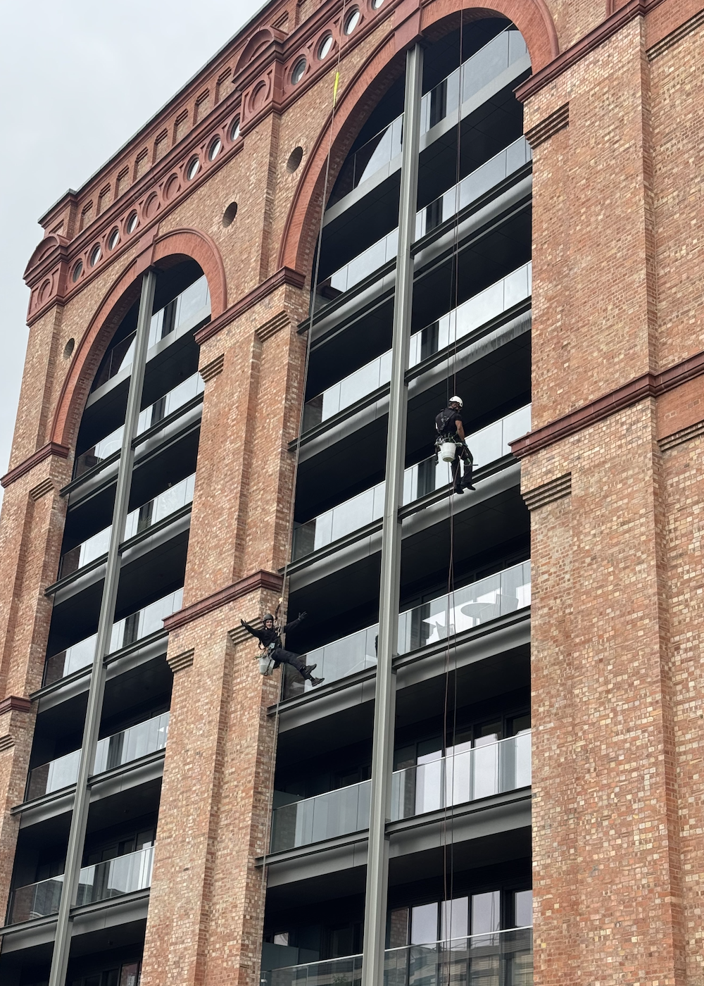 A section of the development is cleaned via a 40m cherry picker and there is a whole building on site which is cleaned using the Water-Fed Pole system.
